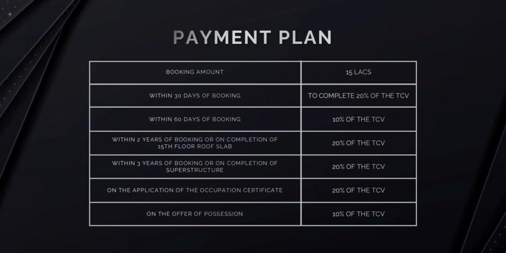 | Booking Amount | 10% | Payable at the time of booking to confirm the unit |