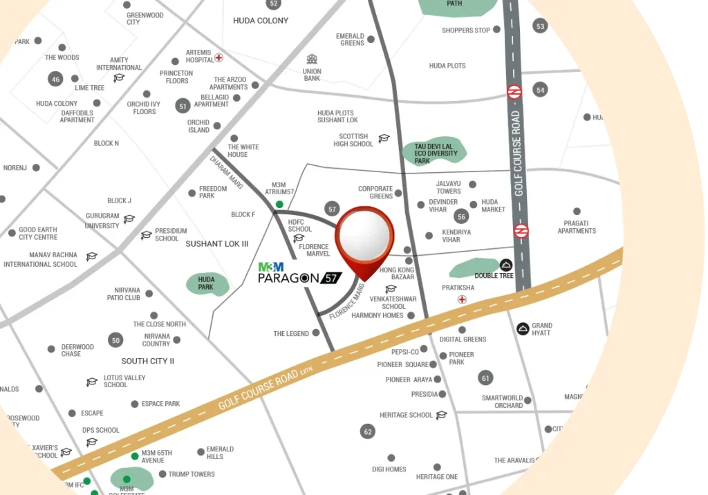One of the biggest strengths of M3M Paragon Sector 57 Gurgaon – Premium Commercial Hub is its prime location. Sector 57 is strategically located near Golf Course Extension Road, which connects several important areas of Gurgaon. The location is surrounded by high-end residential societies, ensuring daily customer footfall for retail businesses.