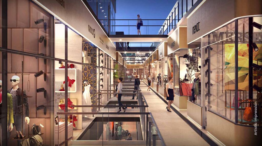 Units: Around 250 retail units, starting from 200 sq ft, with double-height (4.5 m) and triple-height (9 m) showrooms accessible from both lower ground and ground levels.